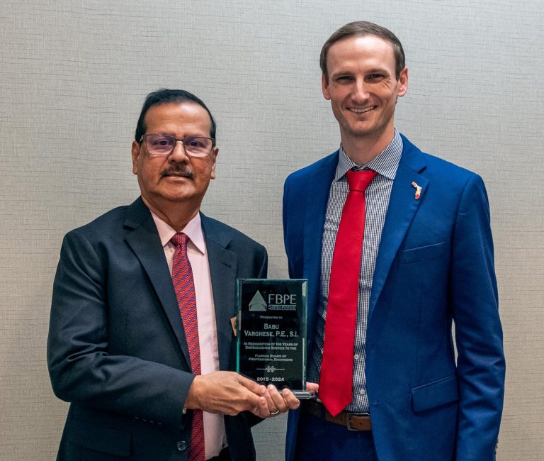 The Florida Board of Professional Engineers said farewell to Board member Babu Varghese, PE, SI, CGC, CCC, at its December 2024 meeting in Tallahassee, Fla. Mr. Varghese was first appointed to the Board in February 2015, serving almost 10 years. In 2019, he served as the Board’s vice chair and was elected chair for 2020. He is the president and principal engineer of Abtech Engineering Inc., a multi-disciplinary engineering firm, which he founded in 1988, in Fort Lauderdale. “If you never had privilege of meeting or working with Babu, you’re missing out on a lifetime opportunity,” Dylan Albergo, PE, who served as Board chair in 2022 and 2023, said. “Babu is a remarkably successful businessman and an even more humble gentleman. He is a mentor to many of us and his expertise, personality, and technical acumen will be severely missed. His work on Special Inspection Certification has made the industry safer and left a lasting impact with the Board. “To me personally, Babu has been an amazing resource and dear friend. Thank you, for your guidance, support, and friendship that have helped to shape me and cement your legacy as an FBPE Board member.”